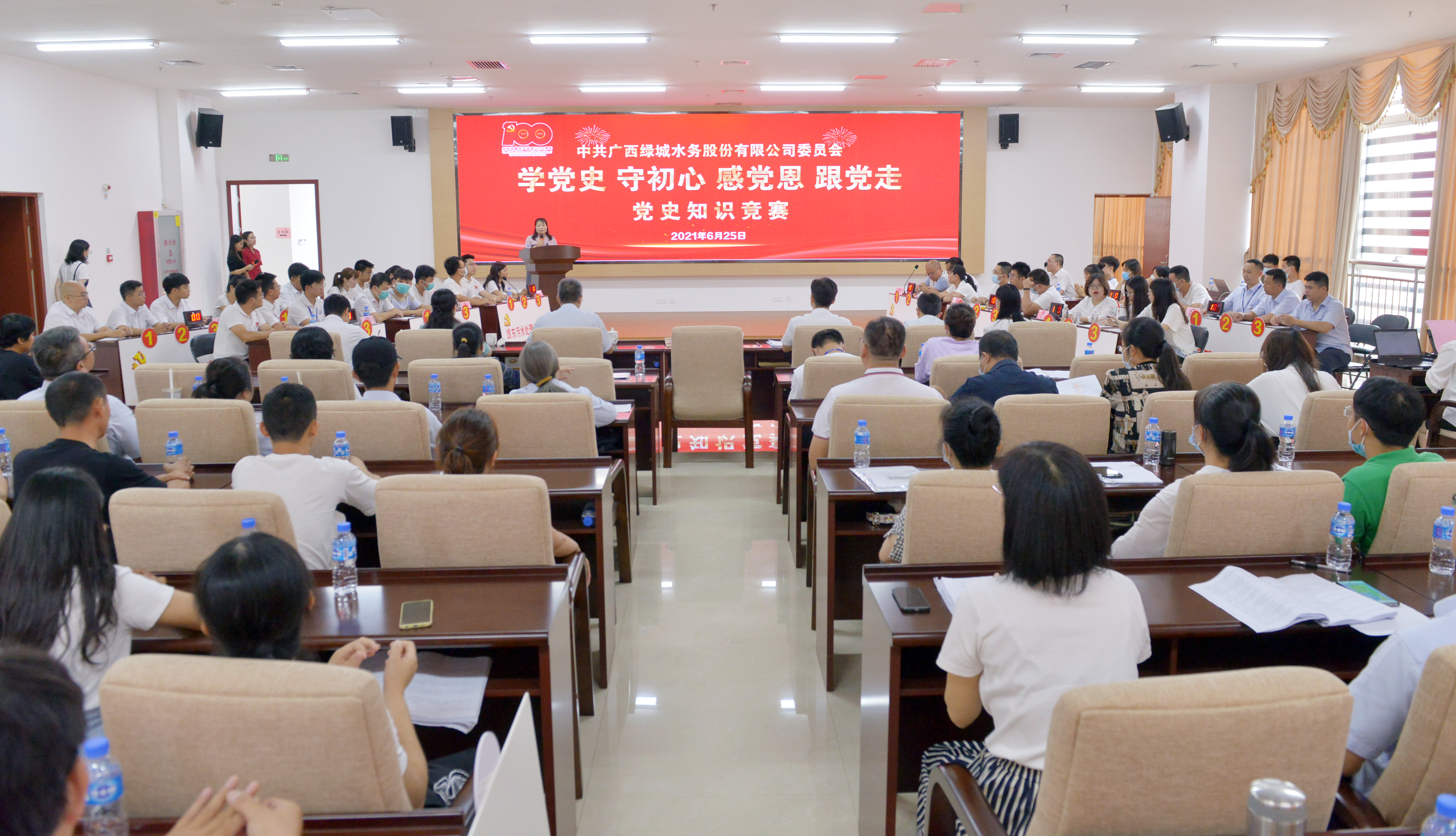 6月25日,廣西綠城水務股份有限公司黨委舉辦“學黨史 守初心 感黨恩 跟黨走”黨史知識競賽,以賽促學,通過競賽帶動廣大黨員干部員工沉下心來學、聯系實際學,推動黨史學習教育入腦入心。集團公司黨委副書記、工會主席陳春麗出席活動并講話,股份公司黨委副書記、總經理徐斌元,股份公司黨委副書記、監事會主席嚴紅兵,股份公司紀委書記何華麗出席活動,集團公司黨委辦公室副主任黃漢宜應邀參加指導競賽活動。